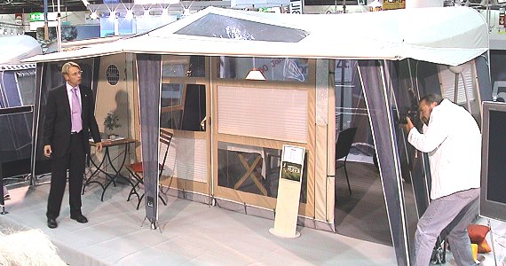 Innovatives Wohnwagen-Vorzelt zum Firmenjubiläum Isabella-Sprecher Jens Lüpkes stellt das neue Vorzelt auf dem Caravan Salon in Düsseldorf vor. (Foto:Richter)(hr) "Vision" nennt Isabella sein neues Vorzelt, das in der Campingsaison 2007 für Furore sorgen soll. Entwickelt wurde es aus Anlass des 50-jährigen Firmenbestehens im kommenden Jahr. An das drei Meter tiefe Vorzelt schließt sich noch ein etwa 1 Meter tiefes Vordach an. Auffallend sind hier vor allem die beiden "Oberlichter" aus transparenter Spezialfolie, welche das Sonnenlicht etwas dämpft. Das Dach steht an den Seiten weit über und verfügt über einen speziellen Regenablauf. Außerdem gibt es an den Seitenteilen schräggestellte Folienabdeckungen über den Moskitonetzbereichen, so dass das Zelt auch bei Regen gut belüftet werden kann.
